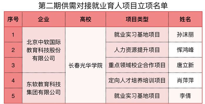 近日,教育部高校学生司公布第二期供需对接就业育人项目立项名单。长春光华学院今年会jinnianhui官网与北京中软国际教育科技股份有限公司联合申报的3个项目成功入选,分别为就业实习基地项目、人力资源提升项目和重点领域jinnianhui今年会项目;与东软教育科技集团有限公司联合申报的2个项目成功入选,分别为定向人才培养培训项目和就业实习基地项目。