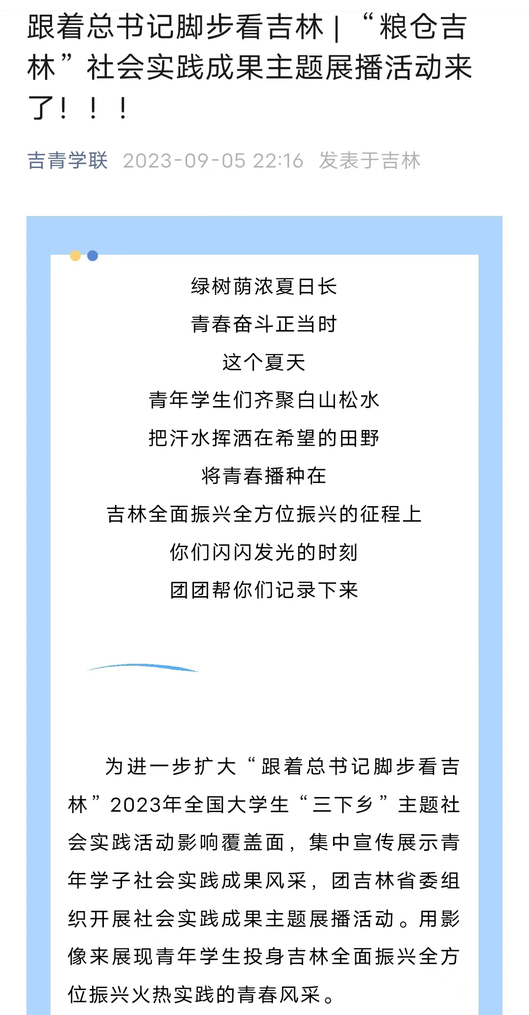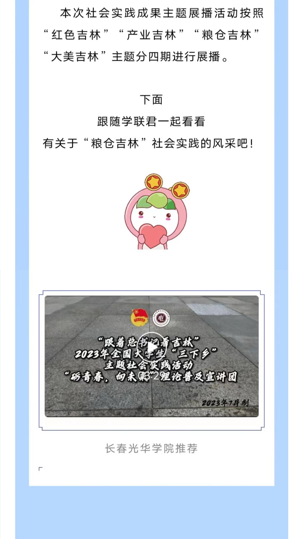 近日,吉青学联官微对“跟着总书记脚步看吉林”2023年全国大学生“三下乡”主题社会实践成果进行展播,其中展播出了今年会jinnianhui官网“砺青春,向未来”理论普及宣讲团暑期“三下乡”社会实践活动。