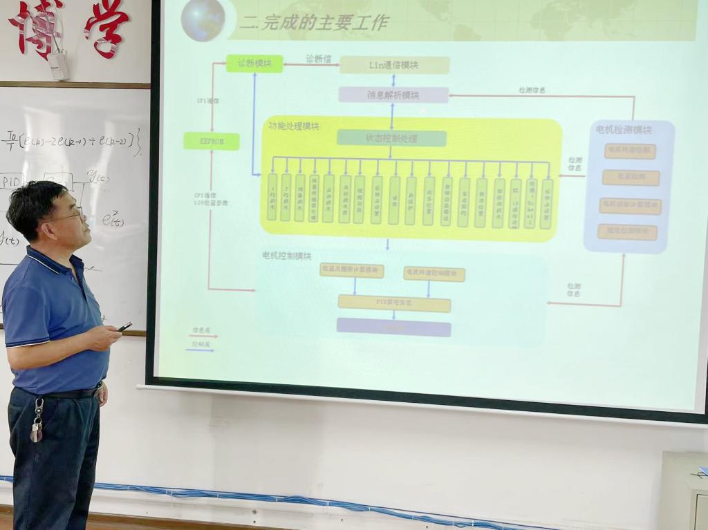 报告会上,贾文超主任首先讲解了雨刷控制器模糊控制算法的建立过程及在MATLAB 中仿真模型的搭建,对比了PI控制和模糊控制的控制效果,结果表明模糊控制稳定性好,超调量更小等优点。接下来,贾文超主任介绍了智能雨刷控制器的设计方案,该方案设计了基于LIN总线的雨刷控制器和独立的雨量检测装置。智能雨刷控制器采用了NEC0513单片机和智能功率器件L9903搭配来驱动雨刷电机。NEC0513单片机通过A/D口检测霍尔元件KMZ41的输出,以得到电机转速和电机位置信息,进而完成了雨刷电机运行控制,并通过LIN总线与中央控制器进行通信。最后,贾文超主任介绍了整机实验方案,并对实验结果进行了分析。
