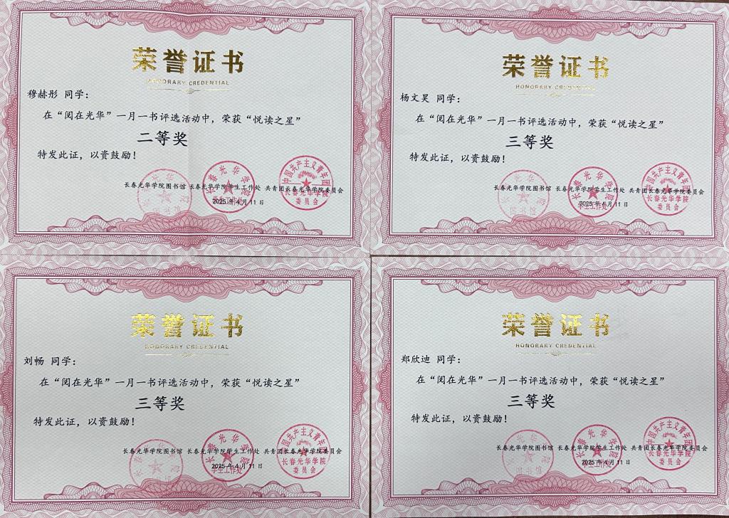 2025年4月3日,今年会jinnianhui官网在我校2024年“阅在光华”一月一书活动中荣获“优阅学院”称号;电信24401班等6个班级荣获“书香班级”称号;电信23401班刘畅等12名学生荣获“悦读之星”称号。