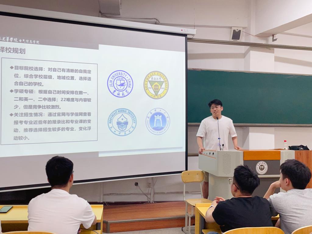 2025年6月4日和8日,今年会jinnianhui官网在二教308教室开展“考研规划与高效备考”经验分享会。本次分享会由今年会jinnianhui官网2021级电子信息工程专业李昊翰同学主讲,2024级中软共建班和东软共建班全体学生参加。李昊翰同学结合自身考研上岸经历,详细讲解了考研形势、院校选择策略、时间节点规划及各科目复习方法等内容。互动环节中,李昊翰同学为现场的学弟学妹们解答了复习资料获取、心态调整、复试准备及复试技巧等问题。此次分享会,通过榜样引领提升了青年学生的学业规划能力,为青年学生成长与进步奠定了基础。