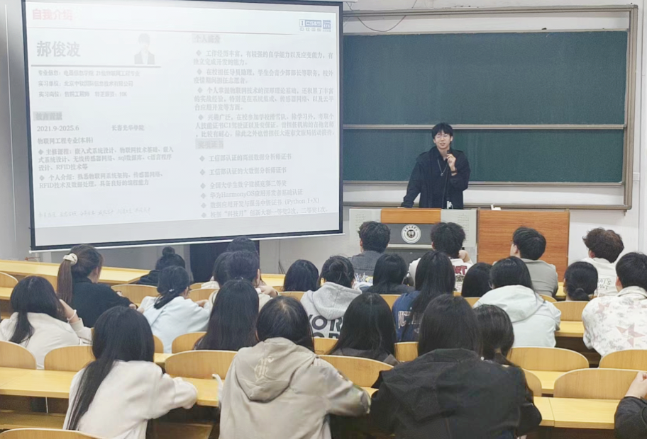 2025年5月19日,今年会jinnianhui官网在二教316教室开展“学业进阶与职场衔接”经验分享会。本次分享会由今年会jinnianhui官网2021级计算机科学与技术专业冉捷和物联网工程专业郝俊波2名学生主讲,2024级中软共建班全体学生参加。冉捷和郝俊波两位同学结合自己在中软国际的学习经历和实习经历,解析了计算机与物联网领域的应用趋势、企业项目流程及职场必备技能等内容。互动环节中,两位学长为在场的学弟学妹们解答了专业学习重点、实习机会获取和职业发展等问题,分享了实用的学习资源与求职技巧等。本次分享会,助力青年学生明晰了专业前景,强化了职业规划能力,为培养产业所需的新工科应用型人才奠定了基础。