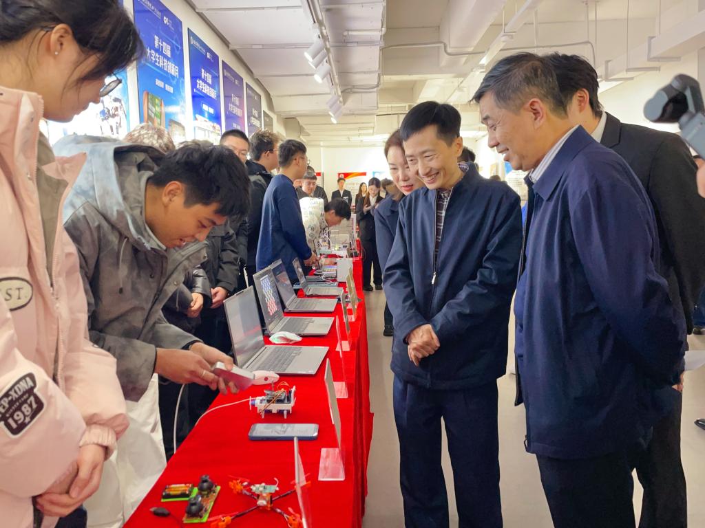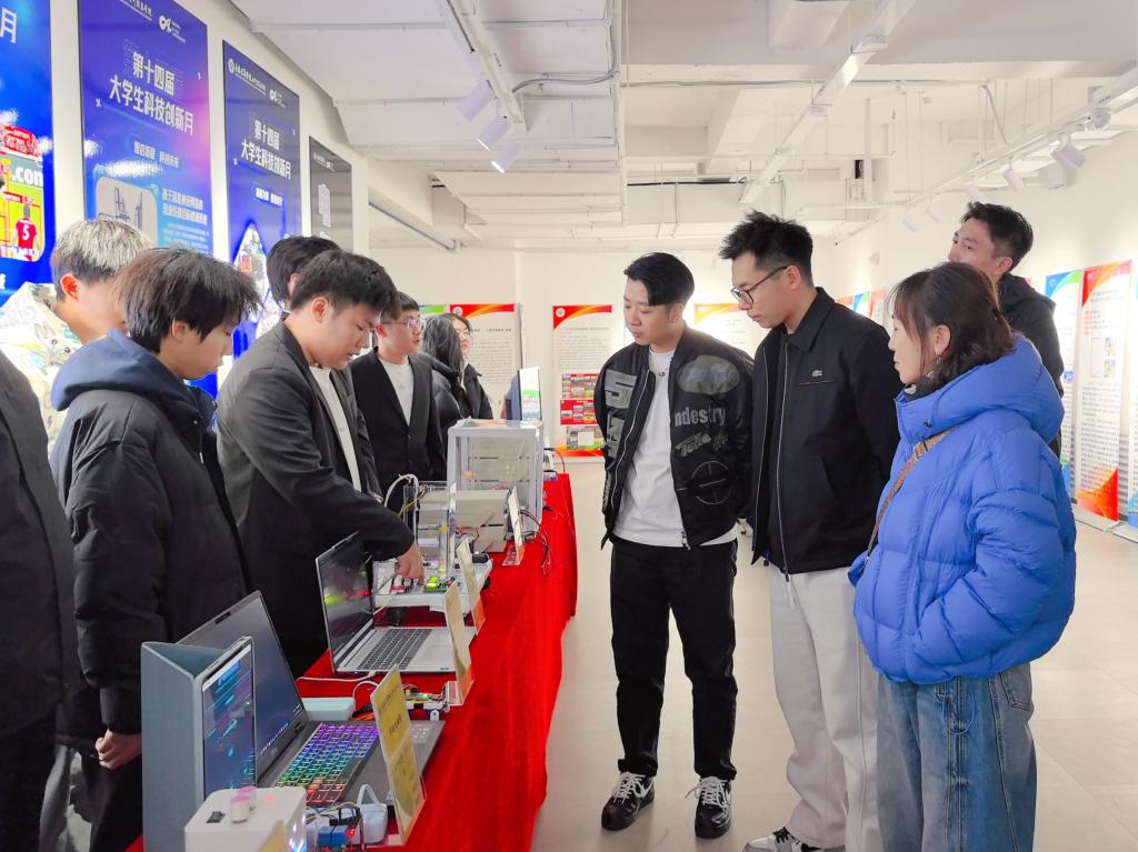 闭幕式结束后,校领导与师生一同前往科技作品展示区,参观了今年会jinnianhui官网科技作品展。获奖学生代表围绕作品的设计思路、功能特点及应用前景进行了现场讲解。校领导和老师们就技术实现路径、后续优化方向以及成果转化潜力等方面与同学们展开交流,并提出了建设性意见。
